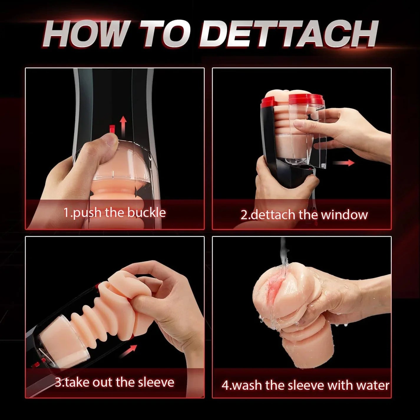 The thrusting male masturbator, which includes a genuine pocket pussy sleeve, has 5 different telescopic frequencies and 10 vibration settings. 3 in 1 CLIMBER will assist you in reaching the peak of the climax. This male stroker toy's full thrusting design replicates the real sex posture of a cowgirl. So you can close your eyes and imagine a lovely lady riding on your penis.